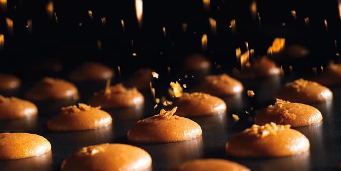 미묘한 비스킷 맛과 맛있게 반짝이는 캐러멜 색상 (마카롱 장식에 베이킹 저항력이 있는)을 가진 순도 높은 버터를 사용하여 만든 “크레페 당텔” 웨이퍼의 곱고 바삭바삭한 조각들.