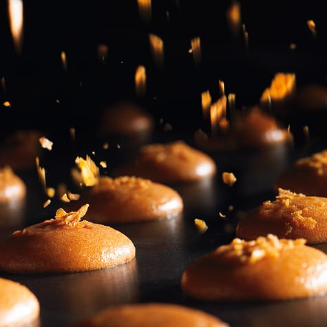 Fine crispy flakes of pure butter "crêpe dentelle" wafer, with subtle biscuity notes and a glowing, delectable caramel c olor (bake-resistant to macaroon decorations).