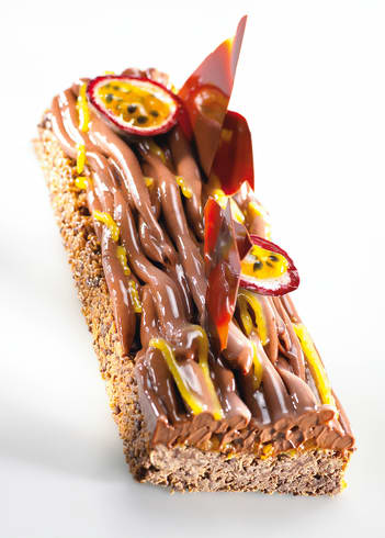 Réaliser le sablé pressé feuilleté chocolat et à l’aide d’une cuillère en parsemer aussitôt 650 g par cadre de 60 x 10 cm puis le presser de façon régulière. Décadrer et réserver au réfrigérateur. A l’aide d’une poche sans douille, dresser environ 180 g de compotée orange sur le sablé. A l’aide d’une poche munie d’une douille de 10 mm dresser environ 300 g de crémeux chocolat sur la compotée, de manière irrégulière dans le sens de la longueur. Pour le décor, dresser irrégulièrement environ 20 g de compotée sur le crémeux. Surgeler le tout. A l’aide du nappage Absolu Cristal chaud, pulvériser les bandes de tarte. Pour terminer le décor des tartes, tempérer de la couverture noire, coller à l’aide d’un peu d’huile des feuilles guitares sur plaques bien plates. Verser une petite quantité de couverture et recouvrir aussitôt d’une seconde feuille guitare puis à l’aide d’un rouleau à pâtisserie, étaler et lisser la couverture en la chassant vers l’extérieur. Vérifier l’épaisseur. Laisser cristalliser à 17°C. Détailler les extrémités des fruits de la passion, les disposer sur la tarte (voir photo) ainsi que quelques éclats de couverture noire. Déposer un logo maison.